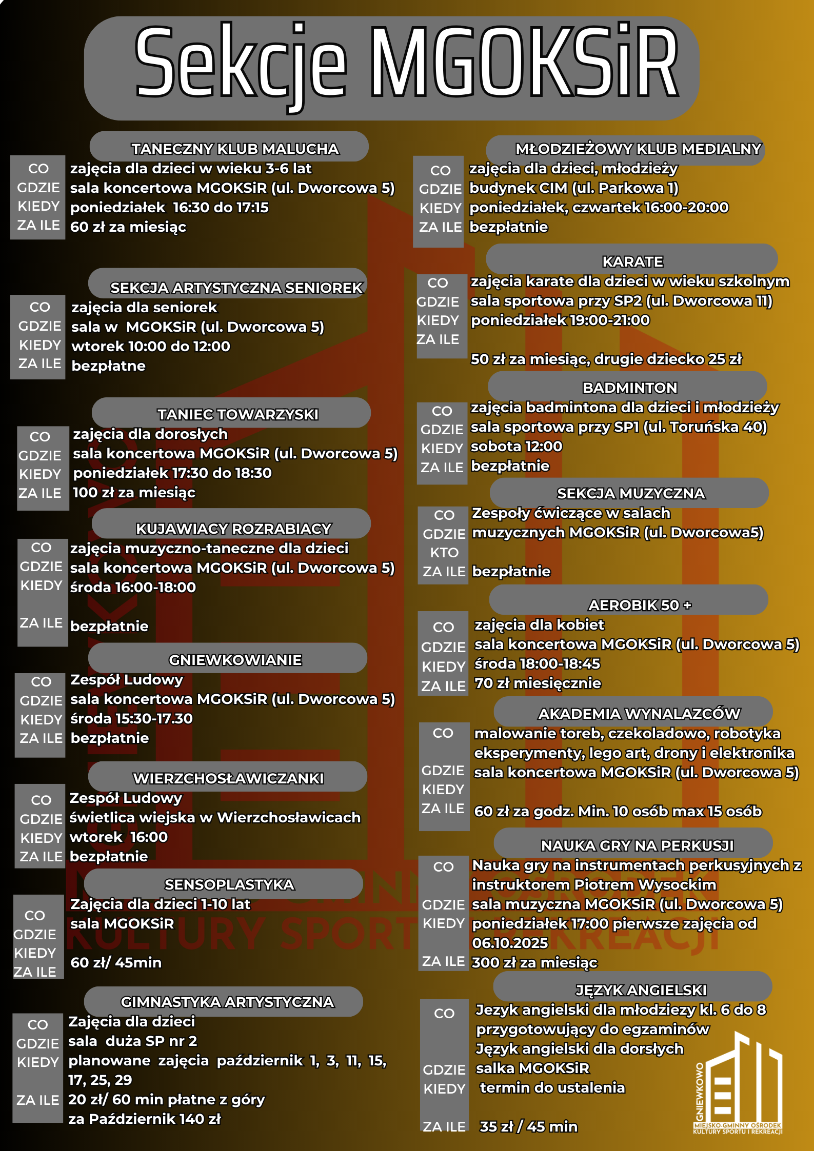 Miejsko-Gminny Ośrodek Kultury Sportu i Rekreacji zaprasza do udziału w bogatej ofercie sekcji i zajęć, które przygotowaliśmy specjalnie dla Was!